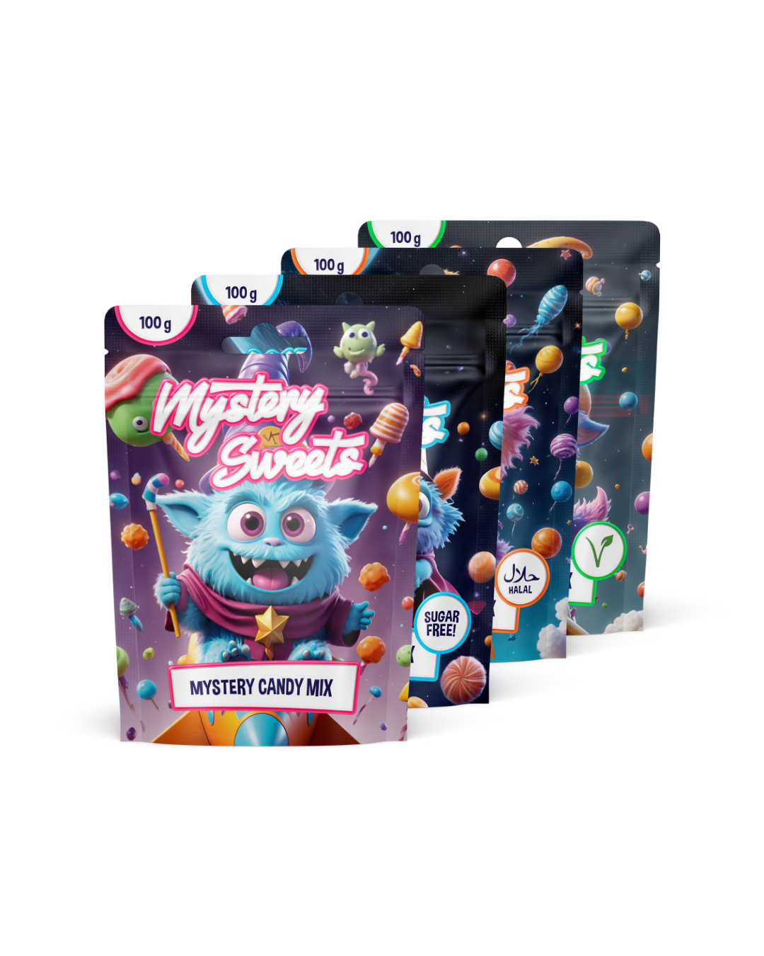 Waarom kiezen als je ze allemaal kunt hebben? Met Mystery’s bundel Candy Mix krijg je niet één, maar 4 magische zakken snoep! In deze bundel zitten de Halal, Vegan, Suikervrije én de klassieke Mystery Candy Mix. Elk in hun eigen zak, boordevol zoete verrassingen.